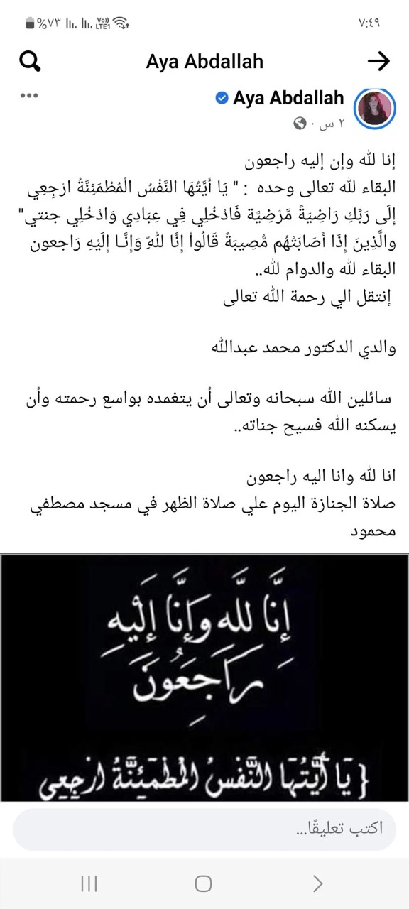 وأضافت اية عبد الله :"البقاء لله والدوام لله إنتقل إلى رحمة الله تعالى، والدي الدكتور محمد عبدالله، سائلين الله سبحانه وتعالى أن يتغمده بواسع رحمته وأن يسكنه الله فسيح جناته، انا لله وانا اليه راجعون، وستقام صلاة الجنازة اليوم على صلاة الظهر في مسجد مصطفي محمود".