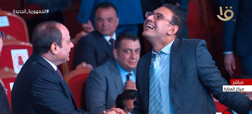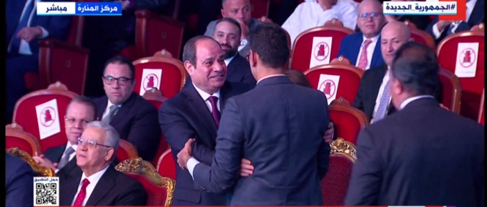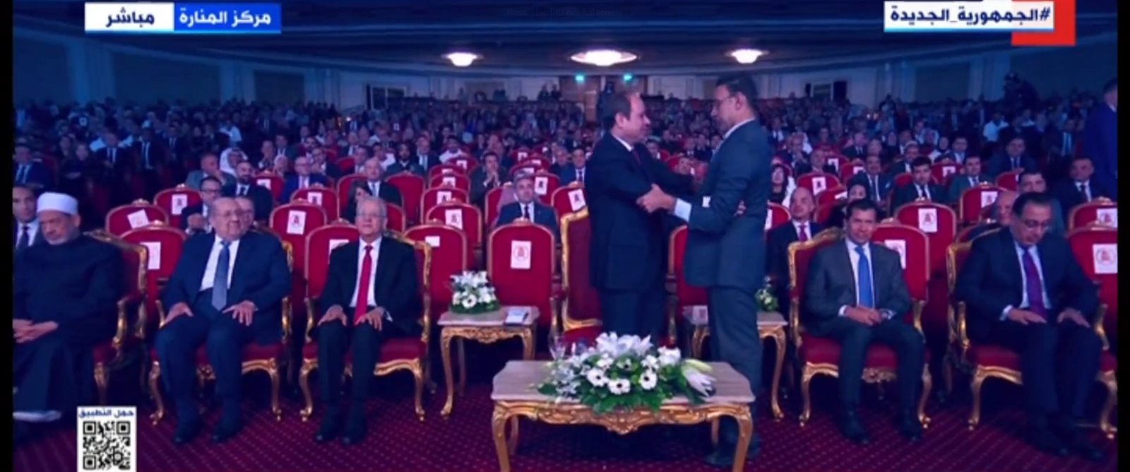 وقدم الرئيس السيسي الشاب من ذوي الهمم ليعرفه على رئيس مجلس النواب الدكتور حنفي جبالي وعاود الشاب معانقة الرئيس مرة أخرى وبدا عليه التأثر الشديد وقال عندما أعطى له الميكرفون للتحدث للحضور "أنا النهارده ملكت الدنيا كلها .. تحيا مصر .. تحيا مصر.. مصر حلوة ..وإحنا حلوين.. وربنا معانا ياريس".