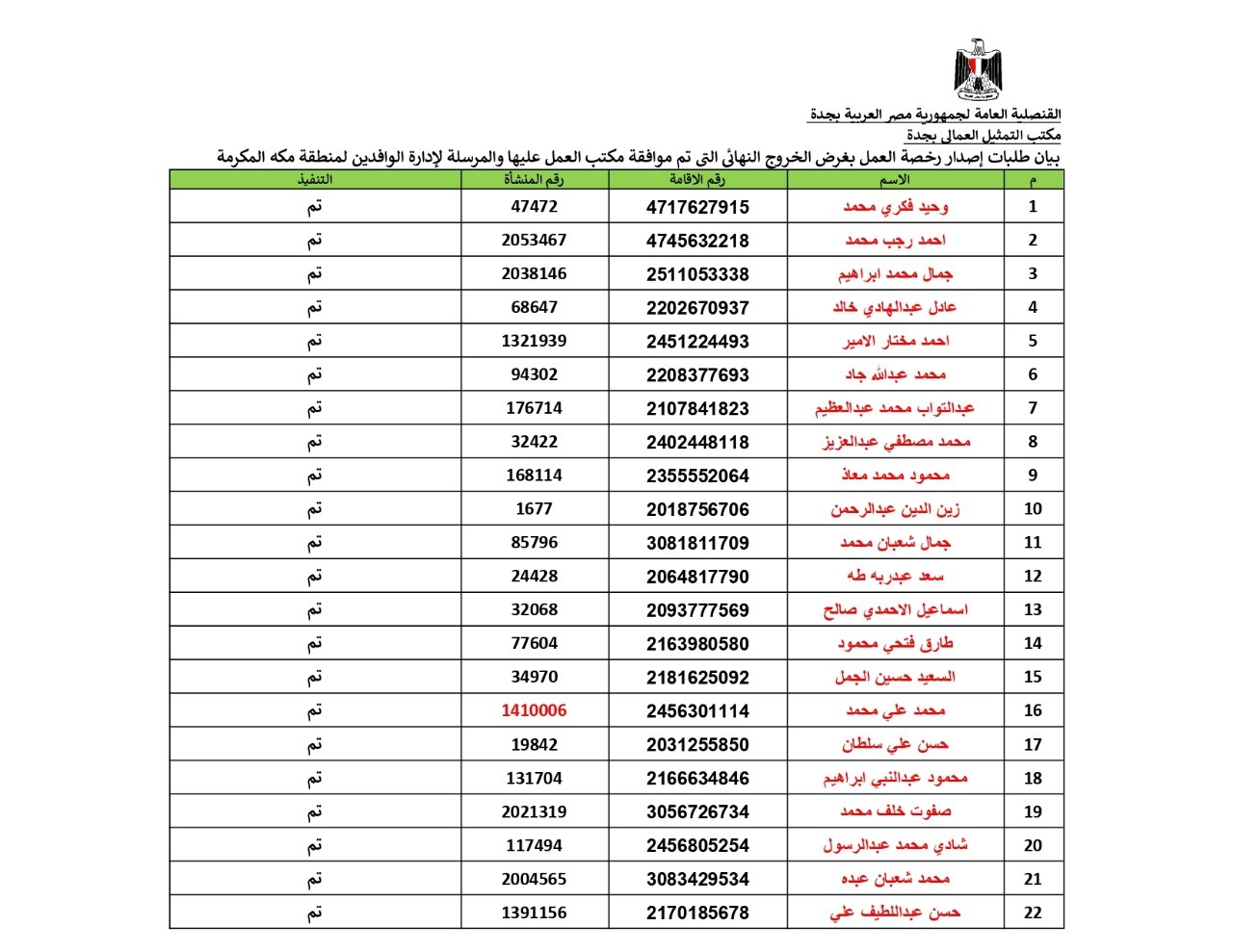 أعلنت وزارة القوى العاملة وبالأسماء، اليوم الأربعاء عن استقبال مكتب التمثيل العمالي بالقنصلية المصرية فى جدة، طلبات من عمالة مصرية للعودة إلى مصر، وذلك بإجمالى 51 طلباً، تمهيداً لاصدار رخصة عمل بغرض الخروج النهائى من "المملكة"، بسبب إنتهاء الإقامة النظامية لهم.