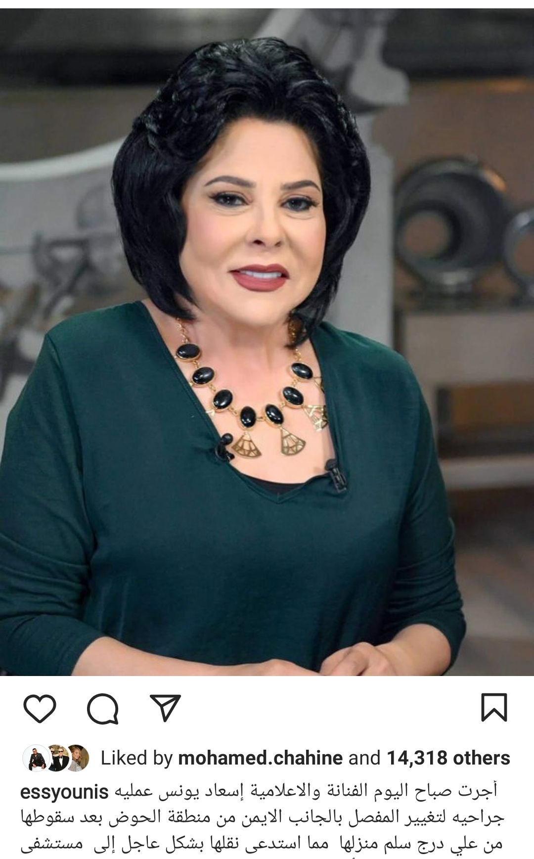 ونشر إسعاد يونس عبر صفحتها الرسمية على موقع إنستجرام قائلة:" أجرت صباح اليوم الفنانة والإعلامية إسعاد يونس عمليه جراحية لتغيير المفصل بالجانب الأيمن من منطقة الحوض بعد سقوطها من على درج سلم منزلها".