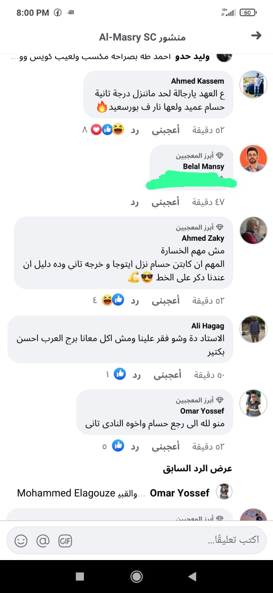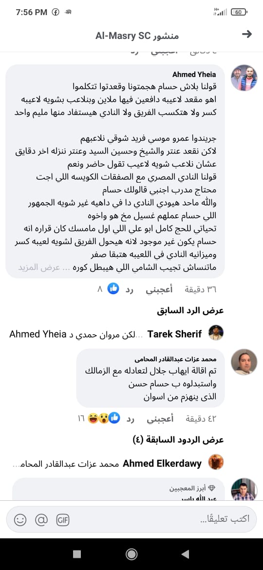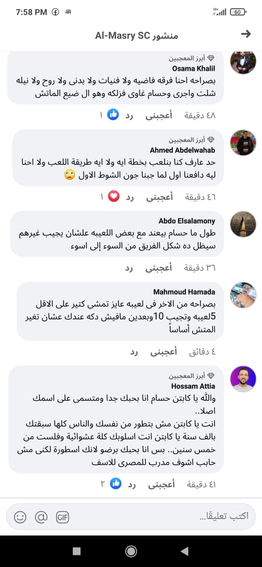 وشنت جماهير البورسعيدي هجوماً شديداً على العميد حسام حسن المدرب الجديد للبورسعيدي عقب الهزيمة أمام فريق أسوان، في المباراة الذي كان يراءه الجميع سهلة على المصري، ولكن قَلب زهرة الجنوب المباراة بتحقيقه ثنائية في مرمى البورسعيدي.