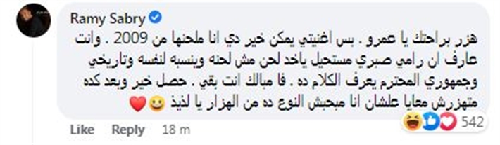 رد رامي صبري على ما ذكره عمرو مصطفى وكتب معلقا: "هزر براحتك يا عمرو، بس أغنيتي (يمكن خير) دي أنا ملحنها من 2009".