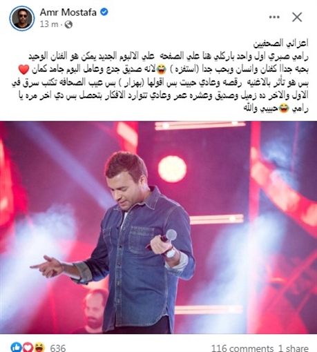 قال: "أعزائي الصحفيين، رامي صبري أول واحد باركلي هنا علي الصفحة علي الألبوم الجديد، يمكن هو الفنان الوحيد،بحبه جدا كفنان وإنسان وبحب جدا استفزه، لأنه صديق جدع وعامل ألبوم جامد كمان".