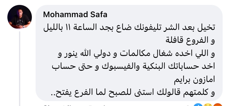 وقال مواطن آخر،" تخيل بعد الشر تليفونك ضاع بجد الساعة 11 بالليل و الفروع قافلة و اللي اخده شغال مكالمات و دولي الله ينور و اخد حساباتك البنكية والفيسبوك و حتى حساب امازون برايمو كلمتهم قالولك استنى للصبح لما الفرع يفتح".