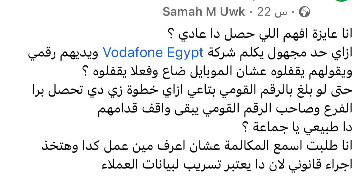 وقال أحد المواطنين،"انا عايزة افهم اللي حصل دا عادي ؟ازاي حد مجهول يكلم شركة Vodafone Egypt ويديهم رقمي ويقولهم يقفلوه عشان الموبايل ضاع وفعلا يقفلوه ؟".