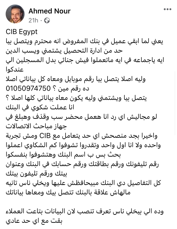 وقال صاحب الشكوي،" CIB Egypt يعني لما ابقي عميل في بنك المفروض انه محترم ويتصل بيا حد من ادارة التحصيل يشتمني ويسب الدين ايه ياجماعه في ايه ماتعملوا فيش جنائي بدل المسجلين الي عندكوا وليه اصلا يتصل بيا رقم موبايل ومعاه كل بياناتي اصلا ده رقم مين ؟ 01050974750 يتصل بيا ويشتمني وليه يكون معاه بياناتي كلها اصلا ؟ ".