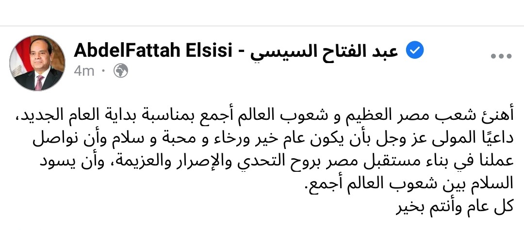وقال الرئيس، عبر صفحته الرسمية بموقع التواصل الاجتماعي فيس بوك، أهنئ شعب مصر العظيم و شعوب العالم أجمع بمناسبة بداية العام الجديد، داعيًا المولى عز وجل بأن يكون عام خير ورخاء محبة وسلام وأن نواصل عملنا في بناء مستقبل مصر بروح التحدي والإصرار والعزيمة، وأن يسود السلام بين شعوب العالم أجمع وكل عام وأنتم بخير.