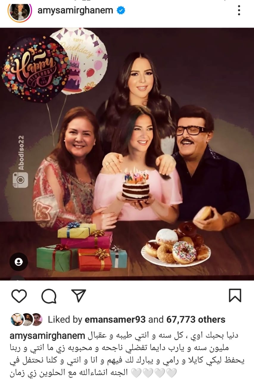 نشرت إيمى سمير غانم صورة تجمعهما بوالديهما الراحلين، عبر حسابها على موقع تبادل الصور والفيديوهات"إنستجرام" وعلقت عليها قائلة: "دنيا بحبك أوى كل سنة وانتي طيبة وعقبال مليون سنة ويارب دايمًا تفضلى ناجحة ومحبوبة زي ما انتي وربنا يحفظ ليكي كايلا ورامي ويبارك لك فيهم وأنا وانتي وكلنا نحتفل في الجنة إن شاء الله مع الحلوين زى زمان".
