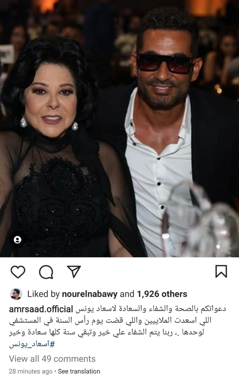 ونشر عمرو سعد، صورة برفقة الفنانة إسعاد يونس، وعلق قائلا: “دعواتكم بالصحة والشفاء والسعادة لإسعاد يونس اللي اسعدت الملاييين واللي قضت يوم رأس السنة في المستشفي لوحدها، ربنا يتم الشفاء علي خير وتبقي سنة كلها سعادة وخير اسعاد يونس”.