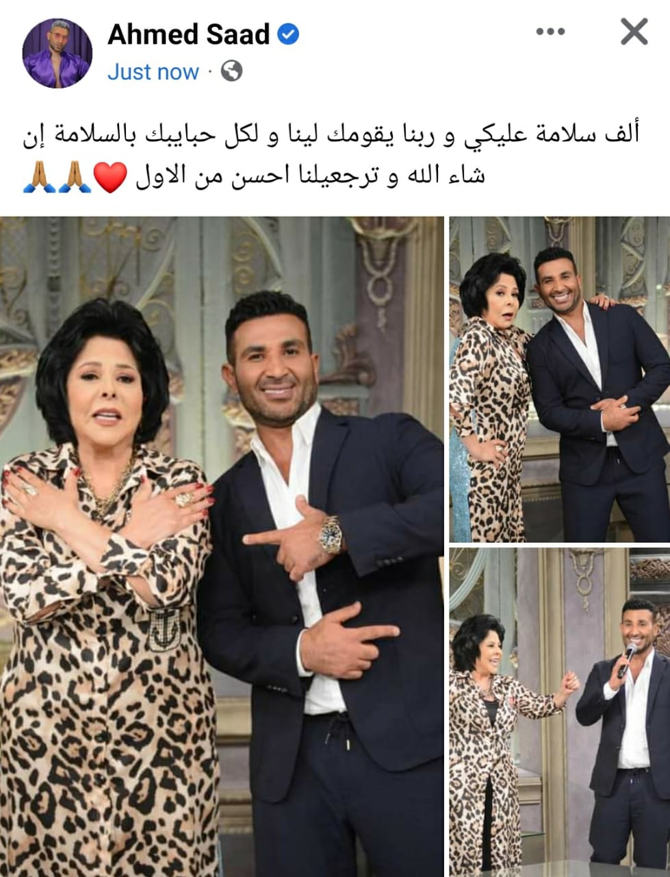 ونشر أحمد سعد عبر صفحته على موق التواصل الإجتماعي"الفيسبوك" صورة تجمعه بها معلق عليها قائلا:"ألف سلامة عليكي وربنا يقومك لينا ولكل حبايبك بالسلامة إن شاء الله وترجعيلنا أحسن من الأول".