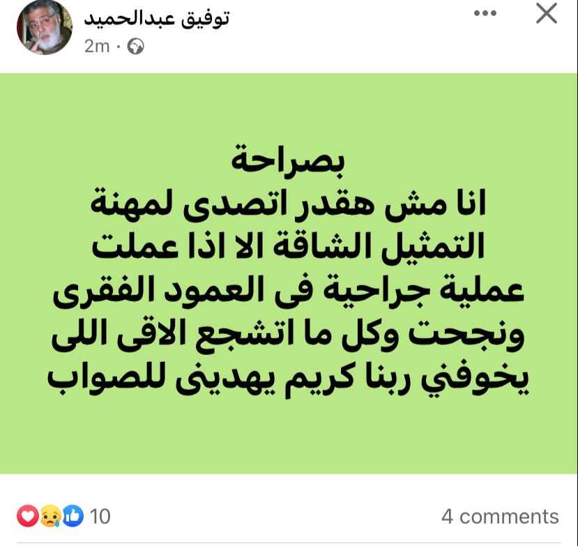 يذكر أن، تراجع الفنان توفيق عبد الحميد عن إجراء عملية جراحية بحسب ما أعلنه وكتب الفنان توفيق عبد الحميد عبر صفحته الشخصية بـ"فيسبوك"،وكتب منشور قال فيه: "صباح الخير والصحة والستر وراحة البال عليكم جميعا، كتر خيركم ربنا ميحرمنيش أبدًا منكم، معظم التعليقات لا تفضل التدخل الجراحي هكمل العلاج المائي والطبيعي وربنا كريم".
