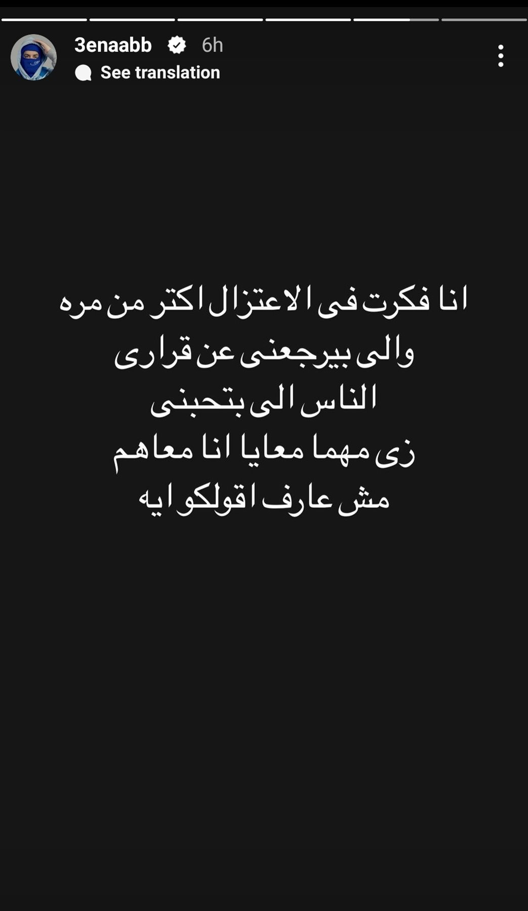 ونشر عنبة، عبر صفحته على موقع تبادل الصور والفيديوهات إنستجرام خلال خاصية الاستوري قائلاً:"انا فكرة في الاعتزال اكتر من مرة والى بيرجعني عن قراري الناس الى بتحبني زي هم معايا انا معاهم ومش عارف اقولكم ايه ".