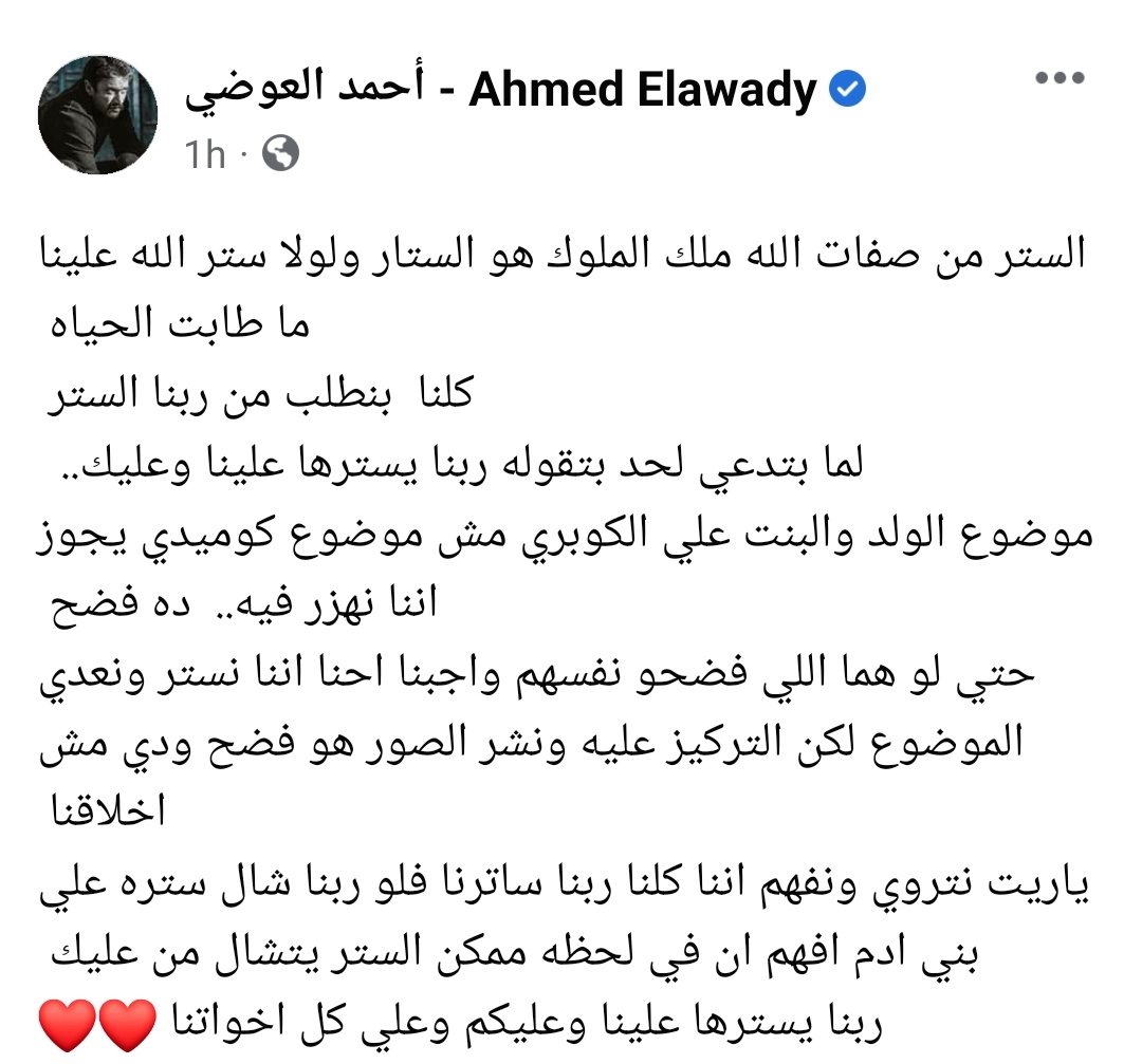 وكتب أحمد العوضي عبر حسابه بموقع التواصل الإجتماعي "فيسبوك" قائلا:" الستر من صفات الله ملك الملوك هو الستار ولولا ستر الله علينا ما طابت الحياة، كلنا بنطلب من ربنا الستر، لما بتدعي لحد بتقوله ربنا يسترها علينا وعليك، موضوع الولد والبنت على الكوبري مش موضوع كوميدي يجوز إننا نهزر فيه، ده فضح".