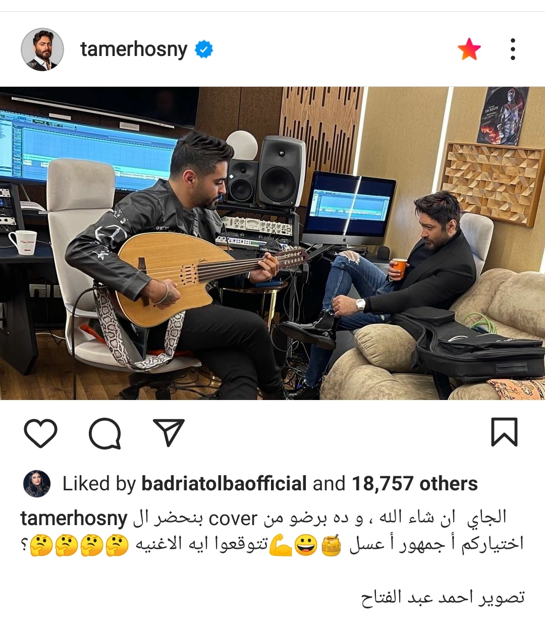 ونشر تامر حسني صورة له من داخل الاستديو، وعلق عليها كاتبًا: “بنحضر من اختياركم أ جمهور أ عسل، تتوقعوا ايه الأغنية؟”.