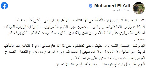 وكتب محمد العدل قائلا :"كنت اتوهم واتعشم أن وزارة الثقافة هي الاستثناء من الاختراق الوهابى ، لكنى كنت مخطئا،اذا كانت وزارة الثقافة والمسرح القومى يقدمون سيرة الشيخ الشعراوى، خليتوا ايه لوزارة الاوقاف، لقد كان الشعراوى على الشط الآخر من الفن والفنانين، وكان ضدكم وضد ثقافتكم، كان يرفضكم جميعا".