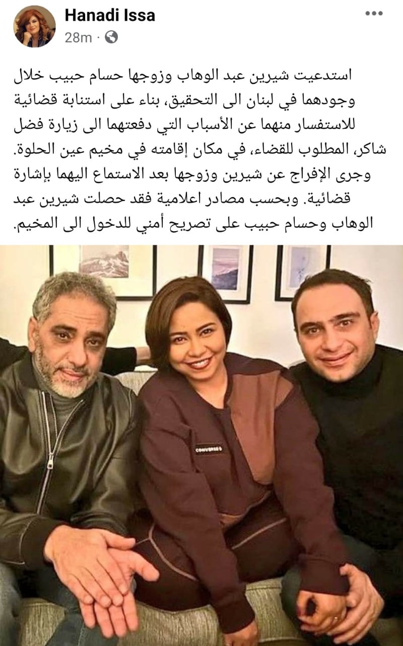 نشرت هنادي عيسى عبر صفحتها على موقع التواصل الإجتماعي “الفيس بوك” قائلة:" استدعيت شيرين عبد الوهاب وزوجها حسام حبيب خلال وجودهما في لبنان الى التحقيق، بناء على استنابة قضائية للاستفسار منهما عن الأسباب التي دفعتهما الى زيارة فضل شاكر، المطلوب للقضاء، في مكان إقامته في مخيم عين الحلوة”.