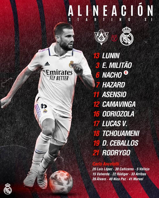 أعلن الإيطالي كارلو أنشيلوتي المدير الفني لفريق ريال مدريد، عن تشكيل فريقه الرسمي لمواجهة كاسيرينيو، على ملعب "الأمير فيليب" في العاشرة من مساء اليوم الثلاثاء، فى دور الـ 32 من بطولة كأس ملك إسبانيا الموسم الجاري 2022-2023.