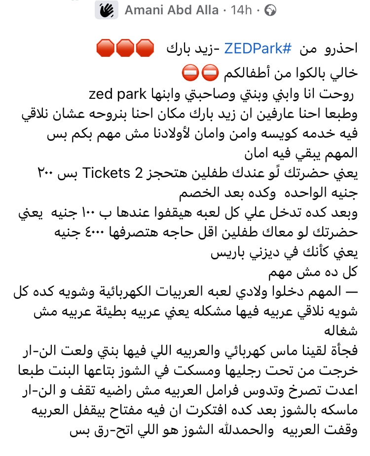 وقالت السيدة فى شكوتها ،"احذرو من ZEDPark -زيد بارك خالي بالكوا من أطفالكم روحت انا وابني وبنتي وصاحبتي وابنها zed park وطبعا احنا عارفين ان زيد بارك مكان احنا بنروحه عشان نلاقي فيه خدمه كويسه وامن وامان لأولادنا مش مهم بكم بس المهم يبقي فيه امان يعني حضرتك لًو عندك طفلين هتحجز 2 Tickets بس 200 جنيه الواحده وكده بعد الخصم وبعد كده تدخل علي كل لعبه هيقفوا عندها ب 100 جنيه يعني حضرتك لو معاك طفلين اقل حاجه هتصرفها 4000 جنيه يعني كأنك في ديزني باريس كل ده مش مهم “.