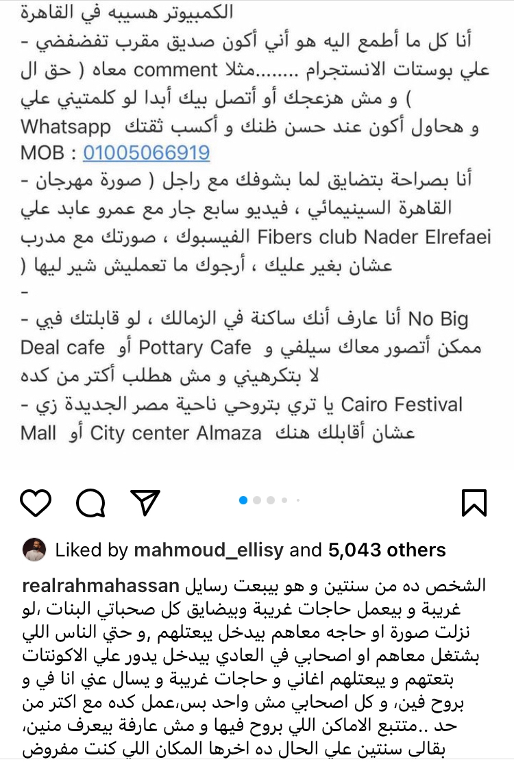 ونشرت رحمة حسن، عبر صفحتها على موقع تبادل الصور والفيديوهات "إنستجرام" قائلة:" الشخص ده من سنين وهو بيبعت رسايل غريبة وبيعمل حاجات غريبة وبيضايق كل صحباتي البنات، لو نزلت صورة أو حاجة معاهم يدخل يبعتلهم".