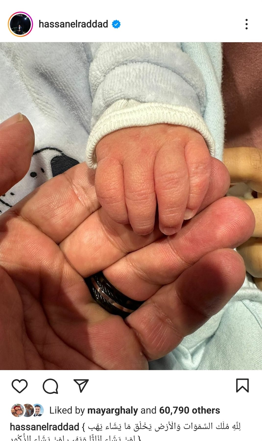 وكتب حسن الرداد عبر صفحته الرسمية بموقع التواصل الاجتماعي" فيسبوك": قائلا: “ لِلَّهِ مُلْك السَّمَوَات وَالْأَرْض يَخْلُق مَا يَشَاء يَهَب لِمَنْ يَشَاء إِنَاثًا وَيَهَب لِمَنْ يَشَاء الذُّكُور، الحمد لله ربنا رزقنا وفي نفس يوم ميلادي بالطفل: فادي حسن الرداد”.