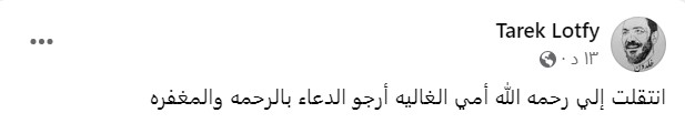 وكتب طارق لطفي، عبر صفحته على موقع التواصل الإجتماعي الفيسبوك قائلا:"انتقلت إلي رحمة الله أمي الغالية أرجو الدعاء بالرحمة والمغفرة".