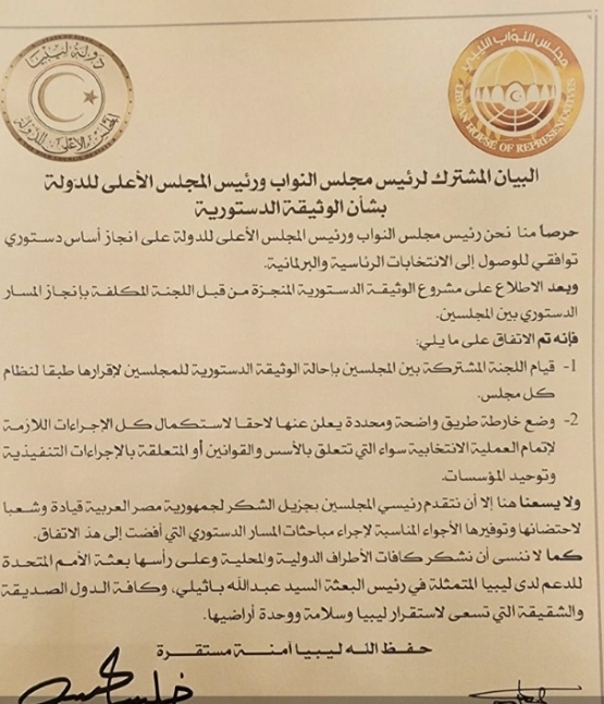وتضمن البيان المشترك بعد التأكيد على أنه وبعد الاطلاع على مشروع الوثيقة الدستورية المنجزة مـن قـبـل اللجنة المكلفة بإنجاز المسار الدستوري بين المجلسين فإنه تم الاتفاق على قيام اللجنة المشتركة بين المجلسين بإحالة الوثيقة الدستورية للمجلسين لإقرارها طبقا لنظام كل مجلس ووضع خارطة طريق واضحة ومحددة يعلن عنها لاحقا لاستكمال كـل الإجراءات اللازمة لإتمام العملية الانتخابية سواء التي تتعلق بالأسس والقوانين أو المتعلقة بالإجراءات التنفيذية وتوحيد المؤسسات.