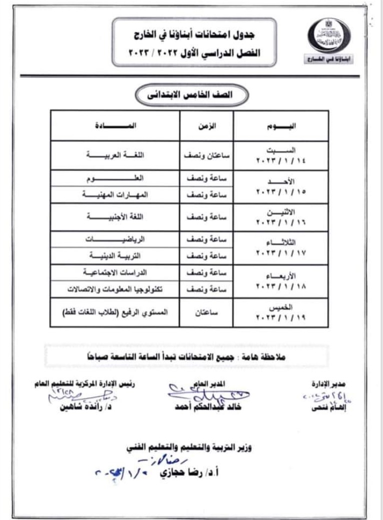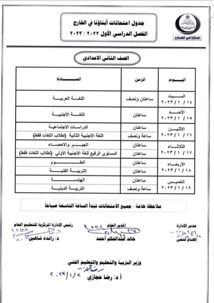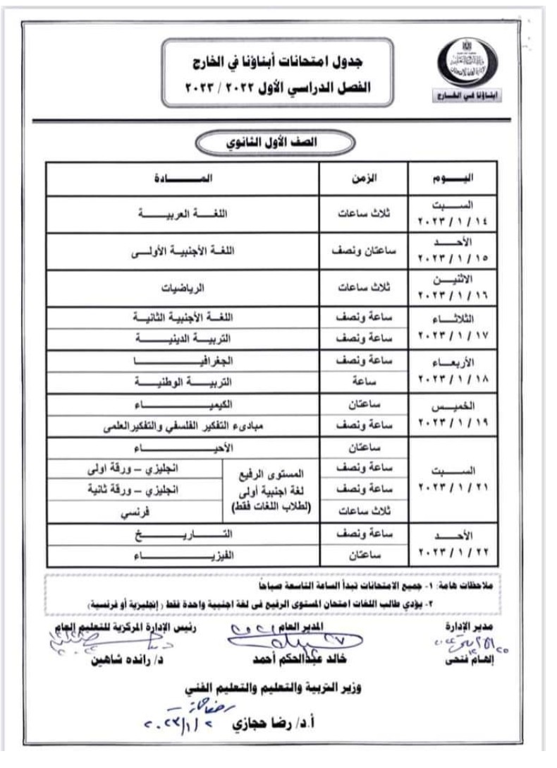 "التعليم" تعلن جداول امتحانات الطلاب المصريين بالخارج للفصل الدراسي الاول