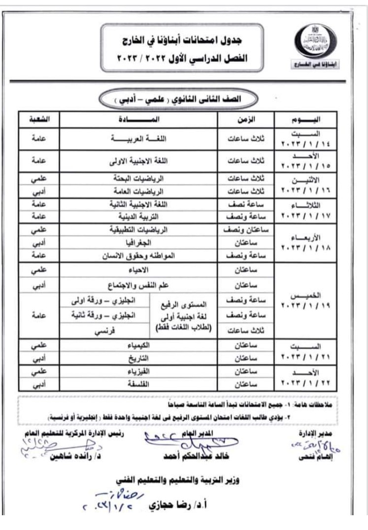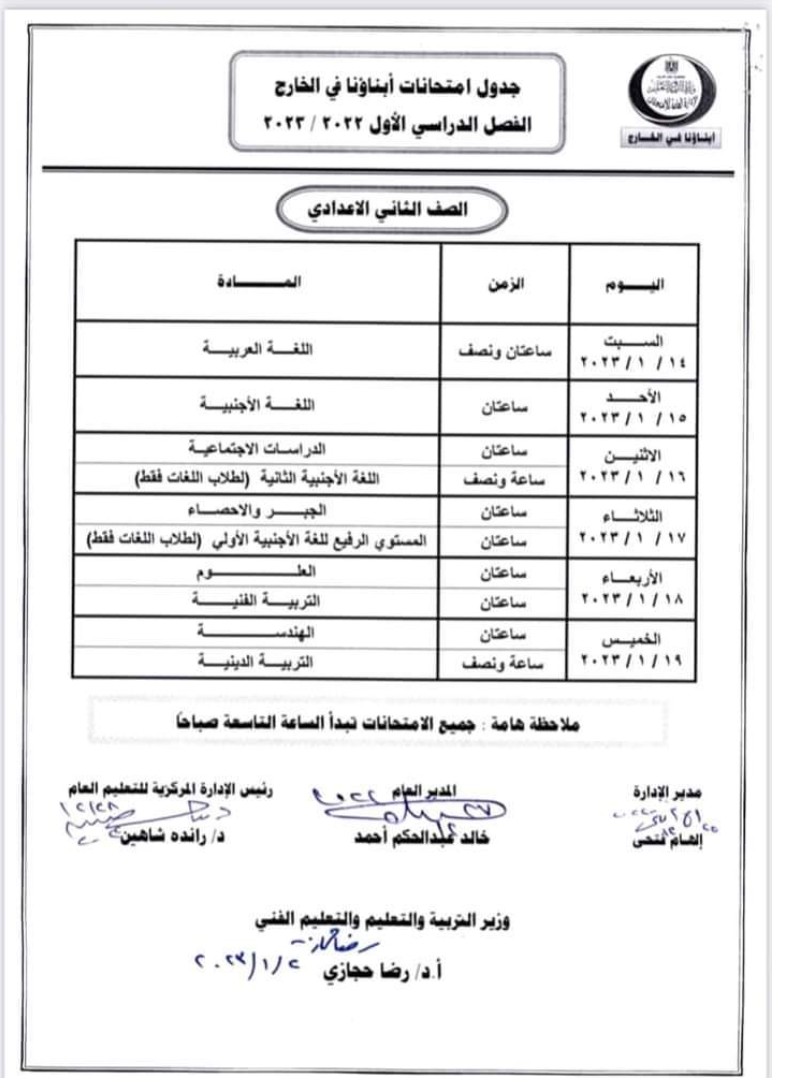 أعلنت وزارة التربية والتعليم والتعليم الفني، جداول امتحانات الطلبة المصريين في الخارج، للفصل الدراسي الأول للعام الدراسي الحالي 2023، من الصف الرابع الابتدائي حتى الثاني الثانوي.