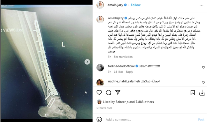 ونشرت أمل حجازي صورة من الأشعة، وعلقت عليها كاتبة: “صار معي حادث قوي الله لطف فيني عندي اكثر من كسر برجلي ومتل ما شايفين تم وضع سياخ وبراغي من الداخل واصابة بالضهر الحمدلله على كل شي يلي حبييت وصلو انو الانسان اذا كان بكامل صحته وقادر يقوم ويجلس هيدي اكبر نعمة مننساها ومنرجع منتذكرها لما نفقدها انك تقدر تنام مش موجوع وتقدر تبرم مرة على جنبك الشمال ومرة على جنبك اليمين براحة هيدي اكبر نعمة ”.