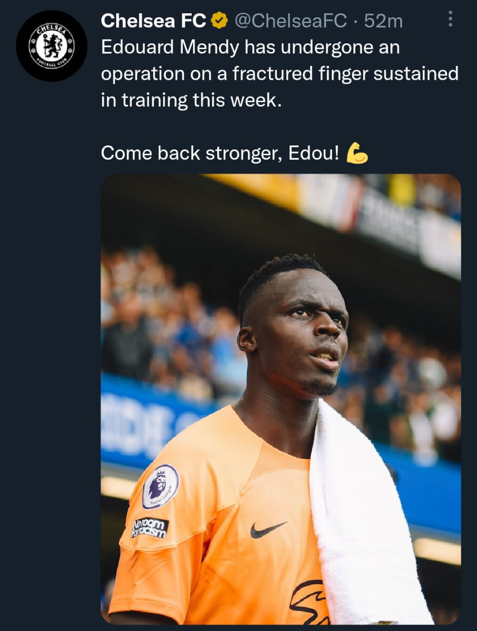 واصدر نادي تشيلسي بيان رسمي عبر موقعه الالكتروني معلقا: "خضع ادوارد ميندي لعملية جراحية، في اصبعه المكسور، اثناء التدريب هذا الاسبوع، عد اقوي ، إيدو".