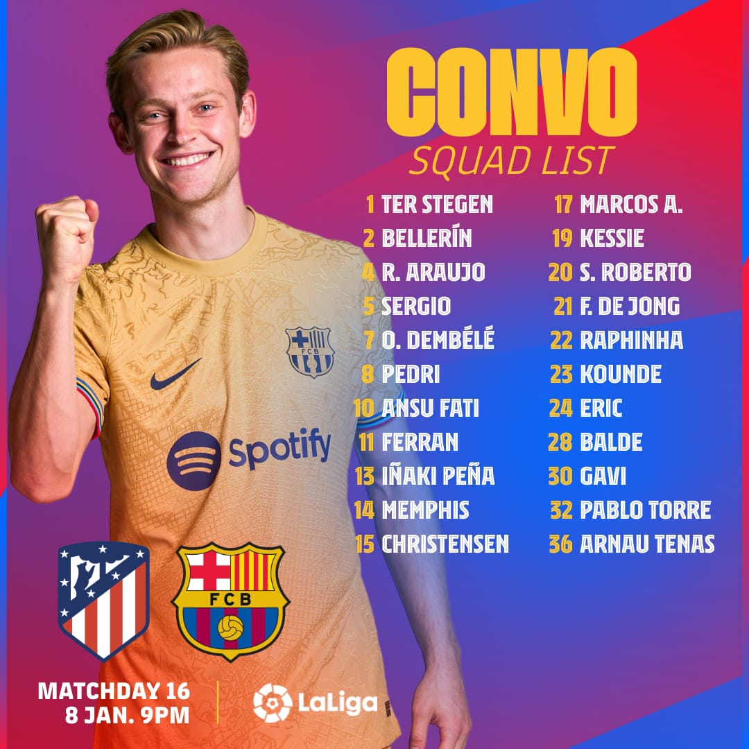 ضمت قائمة برشلونة لمباراة أتلتيكو مدريد كلاً من، "تير شتيجن - بيليرين - أراوخو - بوسكيتس - ديمبلي - بيدري - أنسو فاتي - فيران توريس - إيناكي بينا - ممفيس ديباي - كريستينسن - ماركوس ألونسو - كيسي - سيرجي روبيرتو - دي يونج - رافينيا - كوندي - إريك جارسيا - بالدي - جافي - بابلو توريه - أرناو تيناس".
