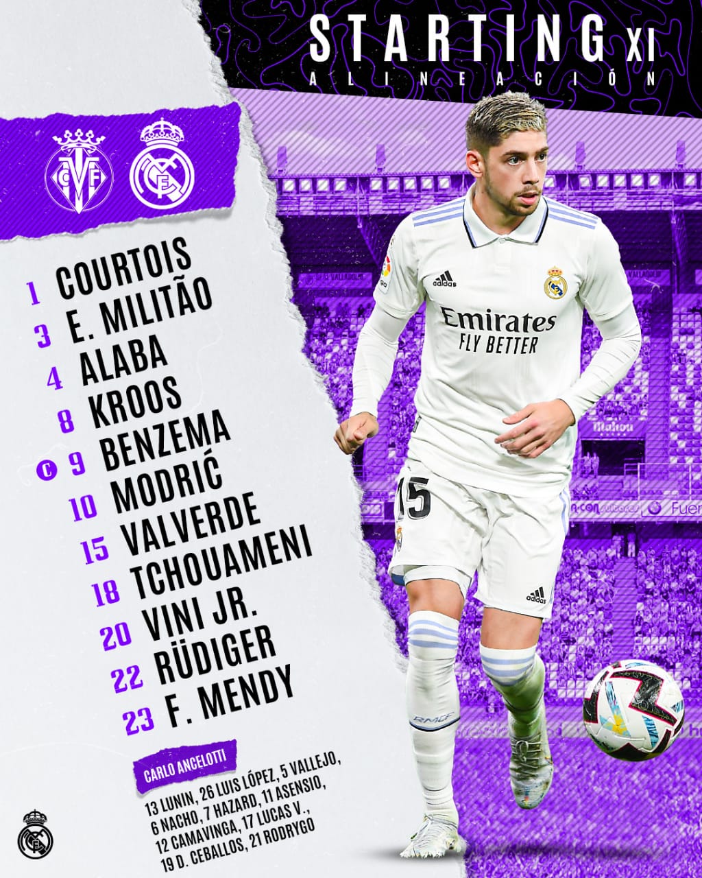 وضم اللتشكيل الرسمي لريال مدريد ضد فياريال كلا من: كورتوافي حراسة المرمي، ميندي ،ألابا ،روديغر، ميليتاو، كروس ، تشواميني ، مودريتش، فينيسيوس ، بنزيما ، فالفيردي، ويحتل ريال مدريد المركز الثاني من جدول ترتيب الدوري الإسباني برصيد 38 نقطة.