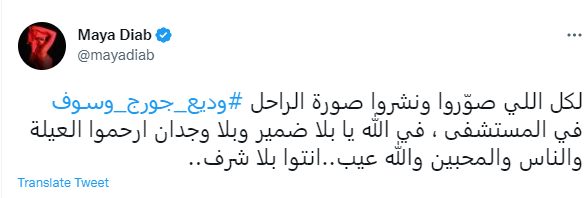كتبت مايا دياب عبر موقع التدوينات القصيرة “ تويتر” مغردة قائلة: "كل اللي صوّروا ونشروا صورة الراحل وديع جورج وسوف في المستشفى في الله يا بلا ضمير وبلا وجدان..ارحموا العيلة والناس والمحبين والله عيب. انتو بلا شرف".