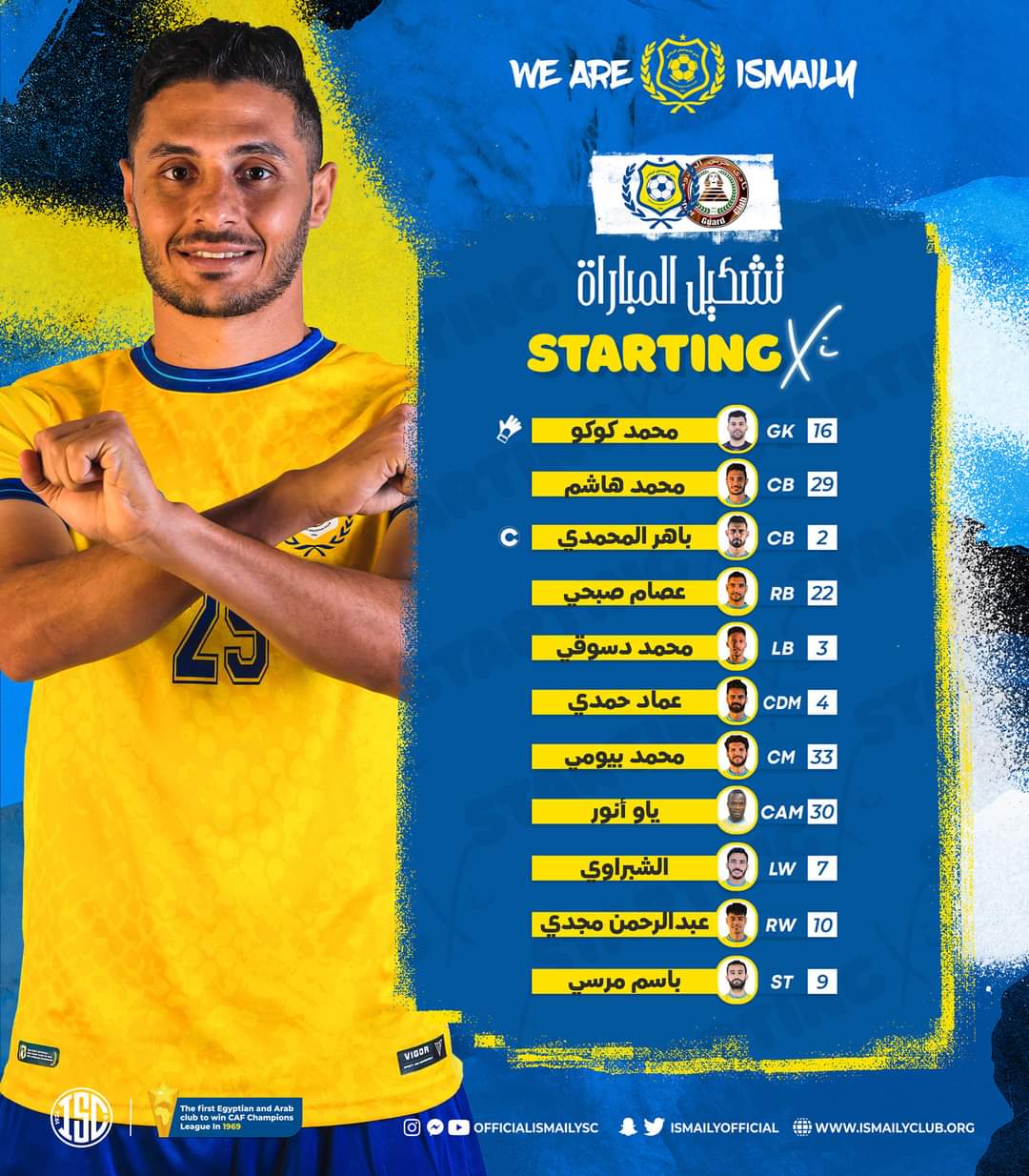 وضم تشكيل الإسماعيلي كلا من: محمد كوكو في حراسة المرمي، محمد هاشم ،باهر المحمدي، عصام صبحي ، محمد دسوقي، عماد حمدي، محمد بيومي، ياو أنور، الشبراوي، عبدالرحمن مجدي، باسم مرسي.