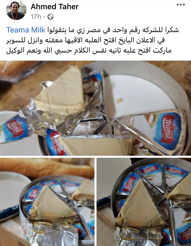 وقال للمواطن ،" Teama Milk شكرا للشركه رقم واحد في مصر زي ما بتقولوا في الاعلان البايخ افتح العلبه الاقيها معفنه وانزل للسوبر ماركت افتح علبه تانية نفس الكلام حسبي الله ونعم الوكيل".