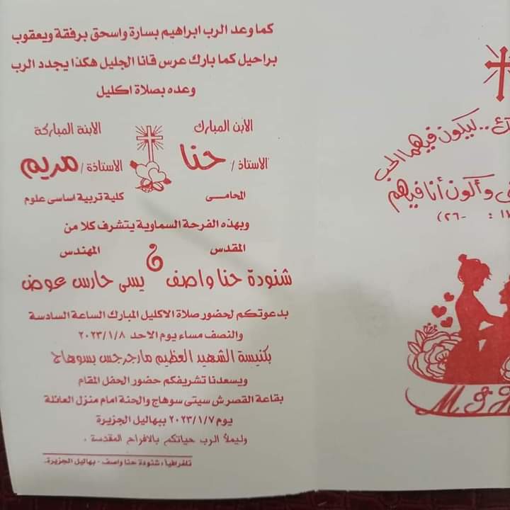 وكان أهالي محافظة سوهاج، قد نعوا المحامي "حنا شنودة" أحد أبناء مركز المراغة الذي توفي يوم صباحيته، مشاركين صورته ودعوة حفل زفافه، داعين الله بشفاء زوجته والرحمة له.