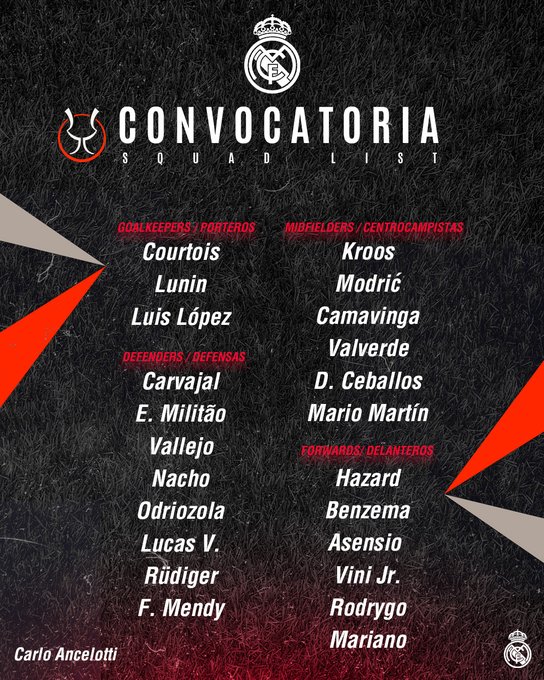 أعلن الإيطالي كارلو أنشيلوتي ، قائمة ريال مدريد الرسمية للمشاركة في بطولة كأس السوبر الإسباني وجاءت تضم: حراسة المرمى: تيبو كورتوا ، لونين ، لويس لوبيز، خط الدفاع: داني كارفخال ، إيدير ميليتاو، فاييخو ، ناتشو ، أودريازولا ، لوكاس فاسكيز ، أنطونيو روديجر ، فيرلاند ميندي، خط الوسط: توني كروس ، لوكا مودريتش ، كامافينجا ، فيدي فالفيردي ، داني سيبايوس ، ماريو مارتن، خط الهجوم: إيدين هازارد ، كريم بنزيما ، أسينسيو ، فينيسيوس ، رودريجو ، ماريانو.