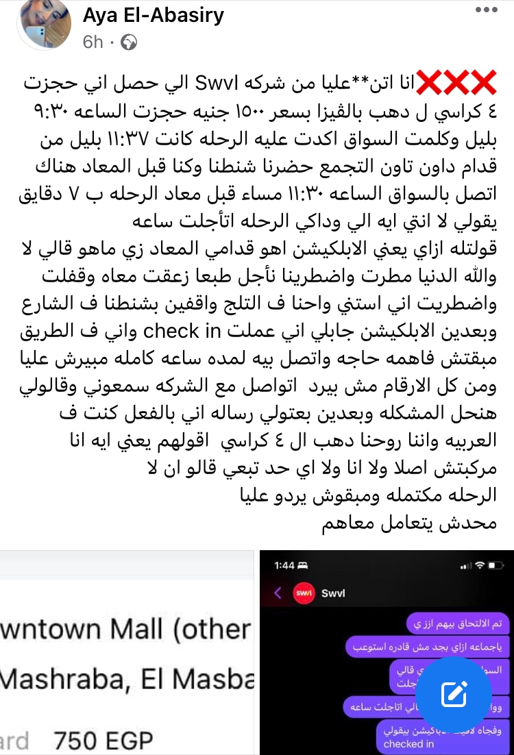 وقالت الفتاة " انا اتنصب عليا من شركه Swvl الي حصل اني حجزت 4 كراسي ل دهب بالڤيزا بسعر 1509 جنيه حجزت الساعة 9:30 بليل وكلمت السواق اكدت عليه الرحله كانت 11:30 بليل من قدام داون تاون التجمع حضرنا شنطنا وكنا قبل المعاد هناك اتصل بالسواق الساعه11:30 مساء قبل معاد الرحله ب 7 دقايق يقولي لا انتي ايه الي وداكي الرحله اتأجلت ساعة".