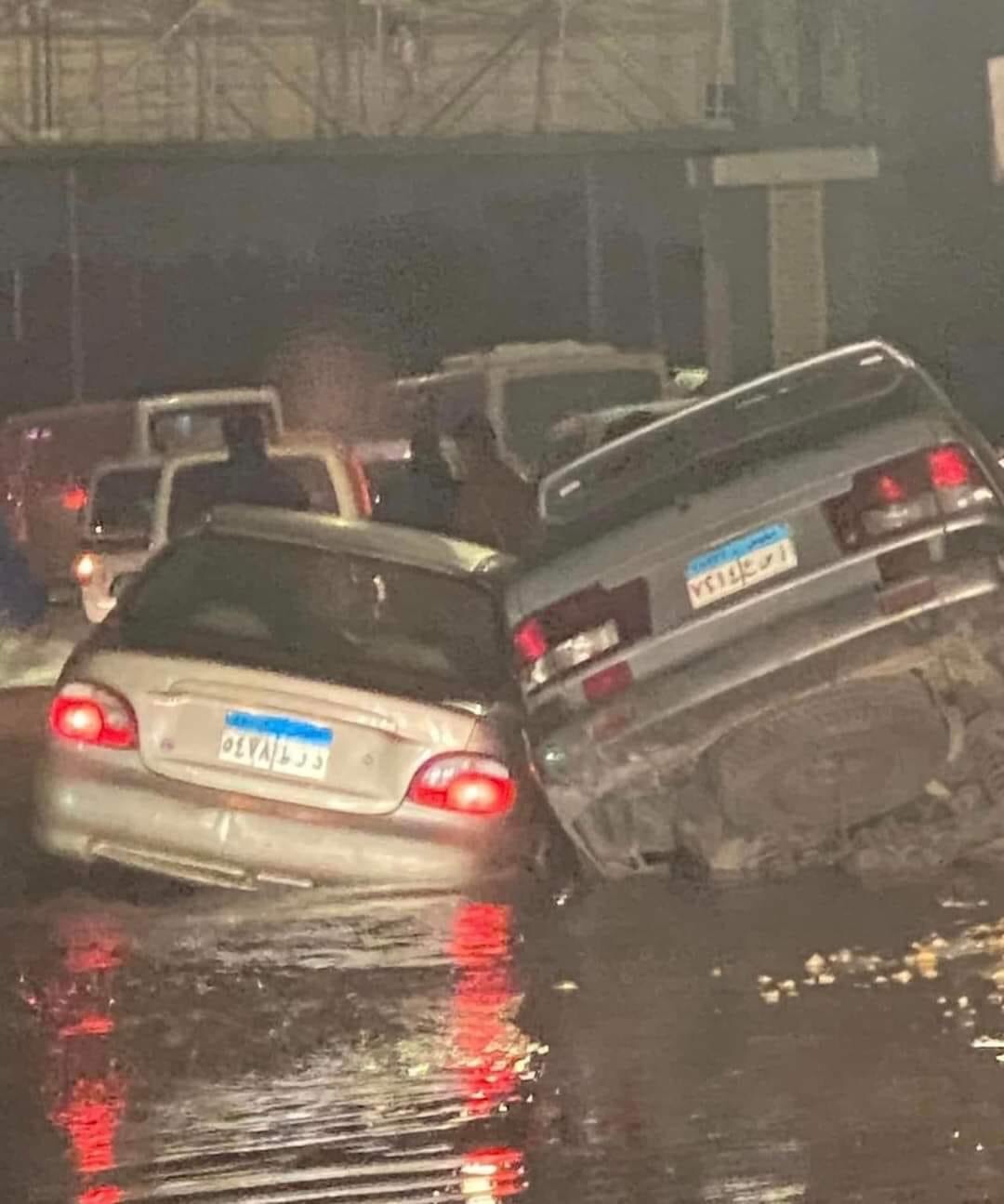 شهد شارع التسعين بالتجمع هبوط أرضي نتج عنه سقوط عدد من السيارات التي تصادف وجودها أثناء الهبوط.