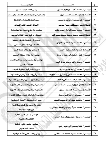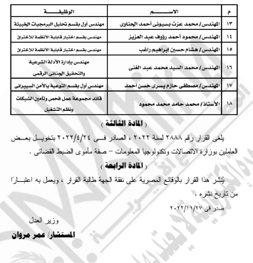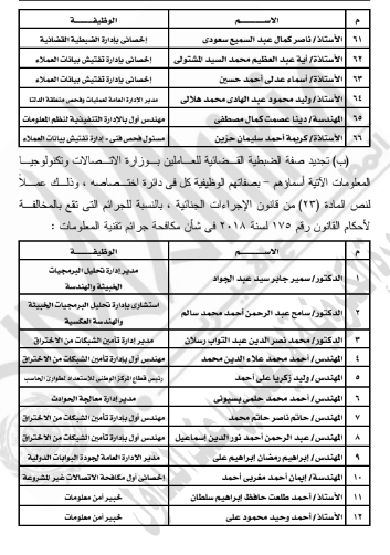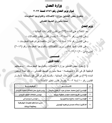 وتجديد الضبطية القضائية لـ 18 عامل أخرين بالوزارة بصفاتهم الوظيفية كل في دائرة اختصاصه، عملا بالقانون رقم 175 لسنة 2018 في شان مكافحة جرائم تقنية المعلومات.
