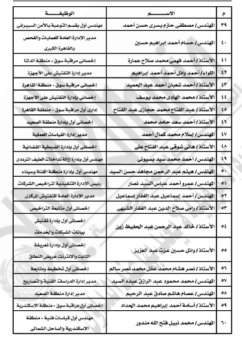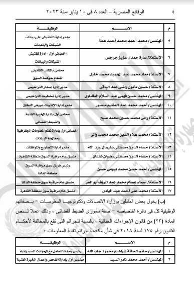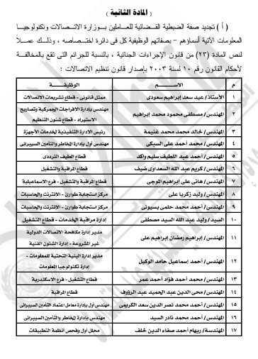 كما نشرت الجريدة قرار بتجديد صفة الضبطية القضائية لـ 66 عامل بوزارة الاتصالات وتكنولوجيا المعلومات الأتية أسمائهم في الكشف التالي، بصفاتهم الوظيفية كل في دائرة اختصاصه، وذلك عملا بنص المادة 23 من قانون الإجراءات الجنائية، بالنسبة للجرائم التي تقع بالمخالفة لأحكام القانون رقم 10 لسنة 2003 بإصدار قانون تنظيم الاتصالات.