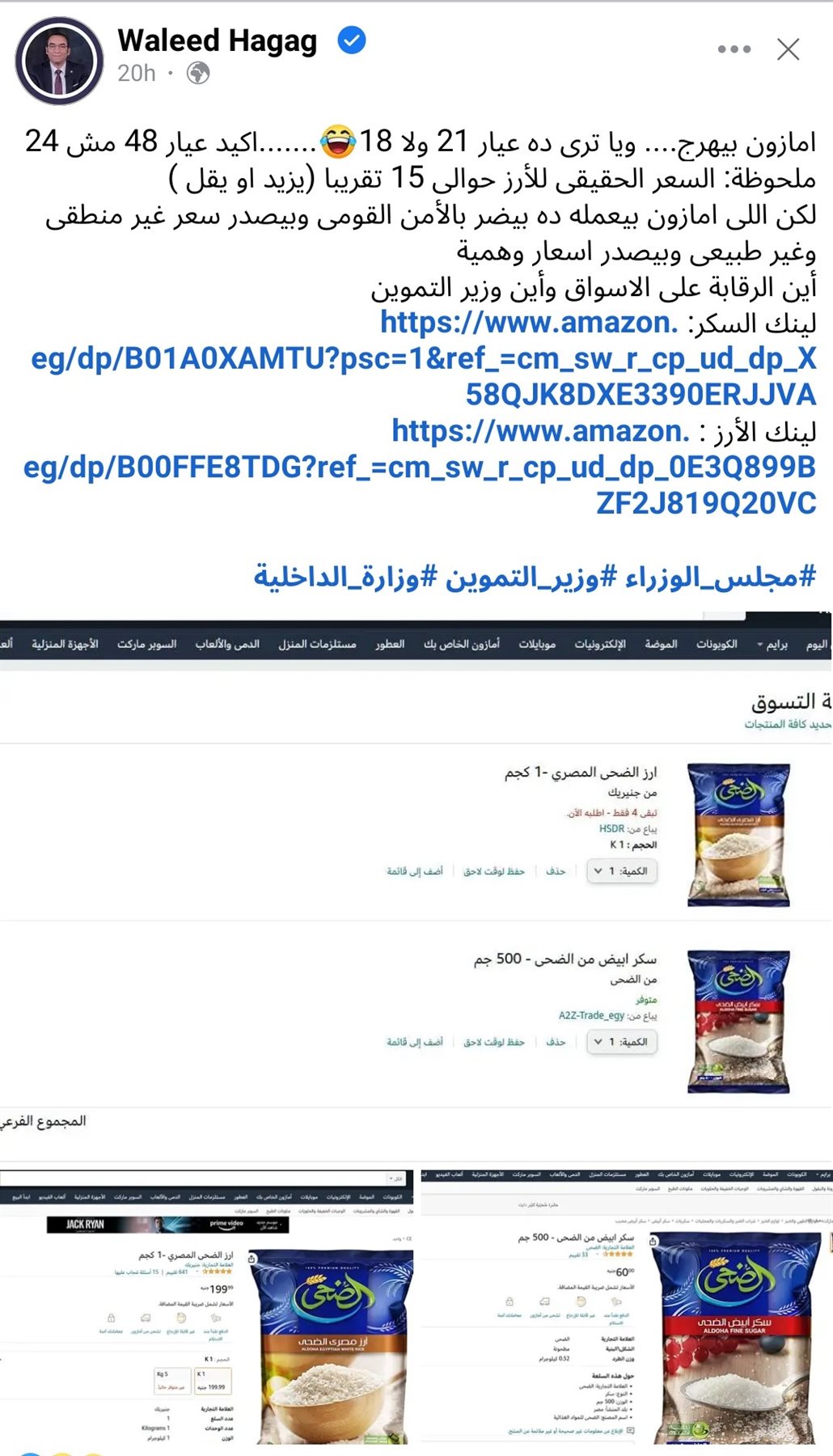 تداول عبر مواقع التواصل الاجتماعي، تعليقات ساخرة من المواطنين بشأن ارتفاع أسعار عدد من السلع الغذائية منها أسعار الأرز والسكر عبر تطبيق أمازون الالكتروني.