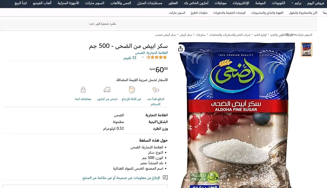 وأعلن موقع أمازون الالكتروني، عن بيع كيلو أرز الضحي بسعر 199 جنيها، بينما وصل سعر نصف كيلو سكر الضحي الي 60 جنيها.