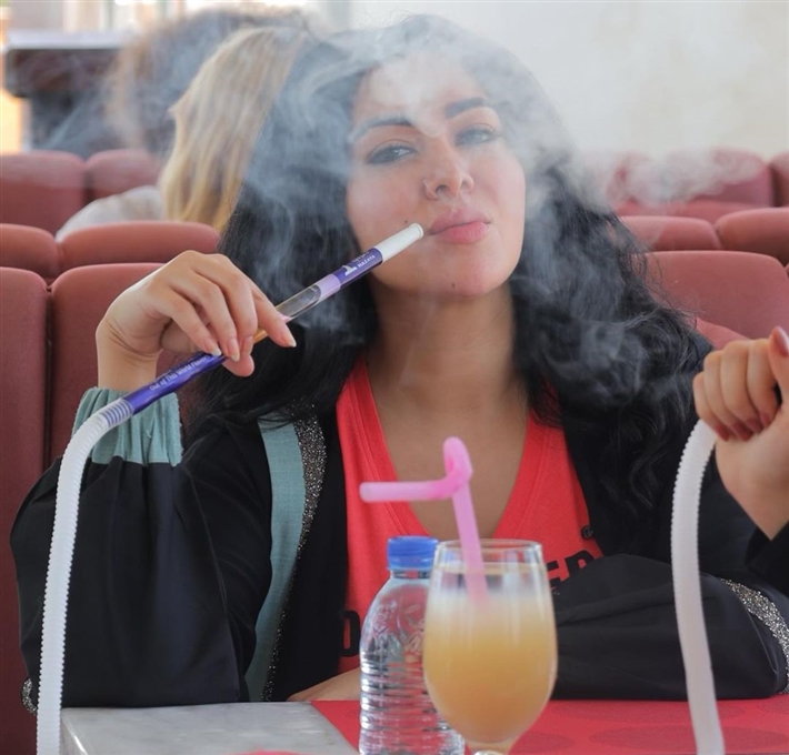ميرهان حسين تدخن الشيشة في كواليس مسلسلها الجديد