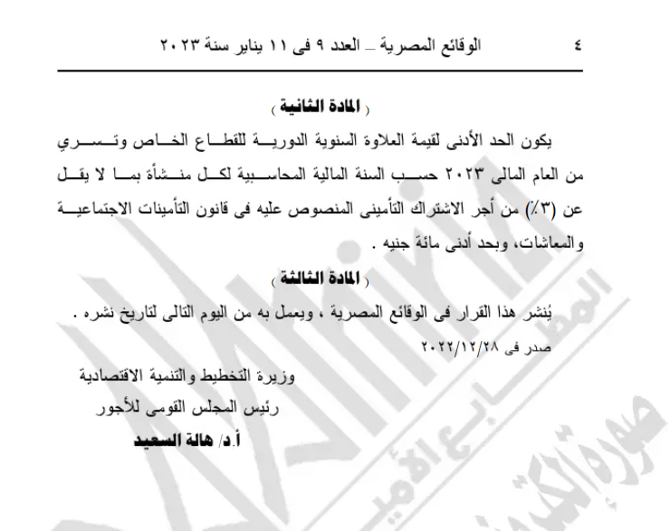 ومحسوبًا على أساس الأجر المنصوص عليه في البند ج من المادة 1 من قانون العمل وجاءت المادة الثانية أن يكون الحد الأدنى لقيمة العلاوة السنوية الدورية للقطاع الخاص وتسري من العام الملي 2023 حسب السنة المالية المحاسبية لكل منشأة بما لا يقل عن 3% من أجر الاشتراك التأميني المنصوص عليه في قانون التأمينات الاجتماعية والمعاشات وبحد أدنى 100 جنيه.