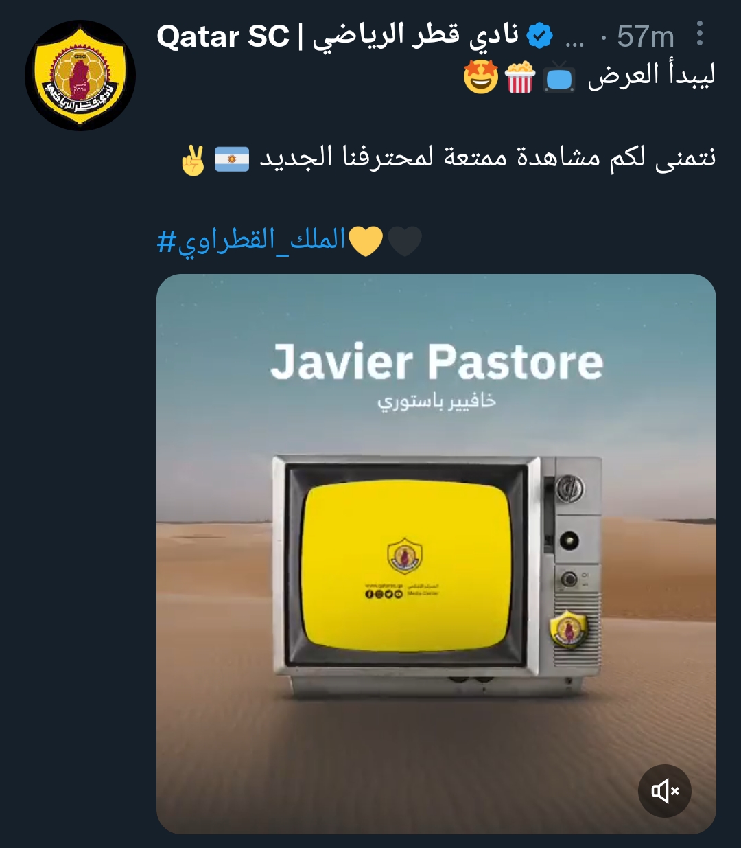 ونشر الموقع الرسمي لنادي قطر الرياضي عبر حسابهم على موقع "تويتر"، صورا من التعاقد معلق عليه: "تعاقد نادي قطر الرياضي مع المحترف الأرجنتين خافيير باستوري قادماً من نادي ألتشي الإسباني لتدعيم صفوف الملك القطراوي".