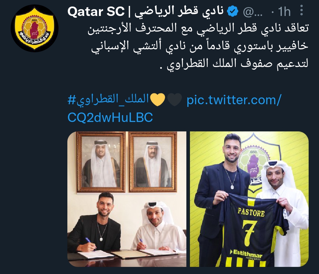 أعلن نادي قطر الرياضي عن تعاقده مع الأرجنتيني خافيير باستوري لاعب باريس سان جيرمان السابق، ولاعب إلتشي الإسباني حاليا، وسيرتدي خافيير باستوري القميص رقم 7 مع فريقه الجديد.