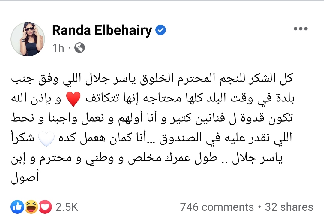 وكتبت الفنانة راند البحيري عبر حسابها الشخصي بموقع التواصل الاجتماعي "فيسبوك"قائلة: " كل الشكر للنجم المحترم الخلوق ياسر جلال اللي وقف جنب بلدة في وقت البلد كلها محتاجة إنها تتكاتف".
