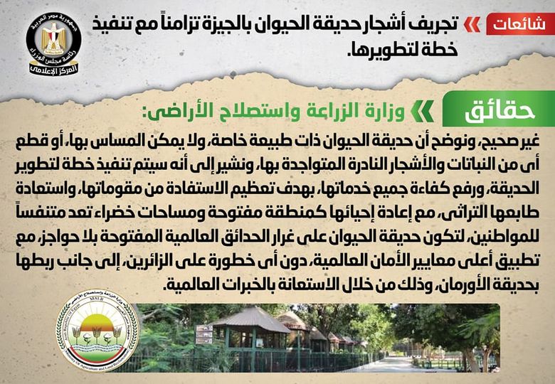 قام المركز الإعلامي لمجلس الوزراء بالتواصل مع وزارة الزراعة واستصلاح الأراضي، والتي نفت تلك الأنباء، مُؤكدةً أنه لا صحة لتجريف أشجار حديقة الحيوان بالجيزة تزامناً مع تنفيذ خطة لتطويرها، مُوضحةً أن حديقة الحيوان ذات طبيعة خاصة، ولا يمكن المساس بها، أو قطع أي من النباتات والأشجار النادرة المتواجدة بها، مشيرةً إلى أنه سيتم تنفيذ خطة لتطوير الحديقة، ورفع كفاءة جميع خدماتها، بهدف تعظيم الاستفادة من مقوماتها، واستعادة طابعها التراثي، مع إعادة إحيائها كمنطقة مفتوحة ومساحات خضراء تعد متنفساً للمواطنين، لتكون حديقة الحيوان على غرار الحدائق العالمية المفتوحة بلا حواجز، مع تطبيق أعلى معايير الأمان العالمية، دون أي خطورة على الزائرين، إلى جانب ربطها بحديقة الأورمان، وذلك من خلال الاستعانة بالخبرات العالمية.