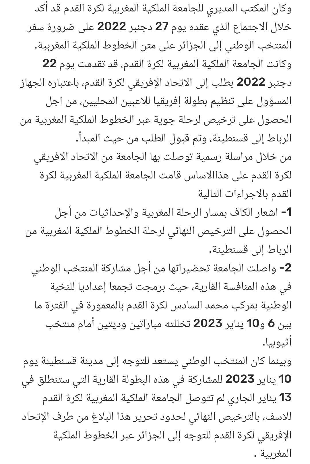 وأضافت الجامعة في بلاغ لها، من خلال مراسلة رسمية توصلت بها الجامعة من الاتحاد الافريقي لكرة القدم على هذا الأساس قامت الجامعة الملكية المغربية لكرة القدم بإشعار الكاف بمسار الرحلة المغربية والإحداثيات من أجل الحصول على الترخيص النهائي لرحلة الخطوط الملكية المغربية من الرباط إلى قسنطينة.